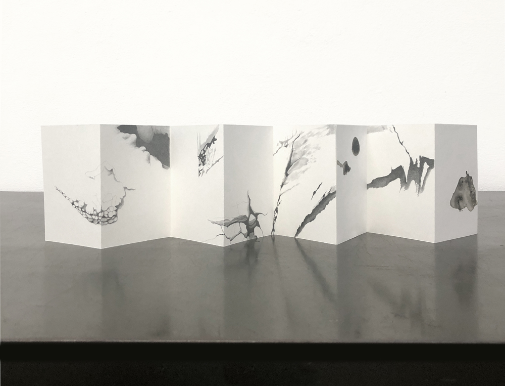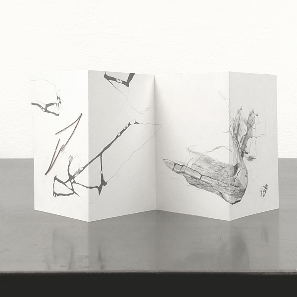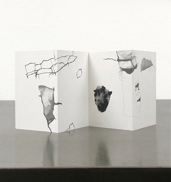 Während eines Arbeitsaufenthalts in Marseille erforschte ich das Massif de Marseilleveyre auf Wanderungen mit dem Fokus auf geologische Strukturen und markante Aspekte der Landschaft – sowohl Erhebungen als auch Tiefen des Massivs, begehbare Grotten und Höhlen. Die Beobachtungen führten u.a. zu einer Serie von Skizzen in Form von Leporellos.